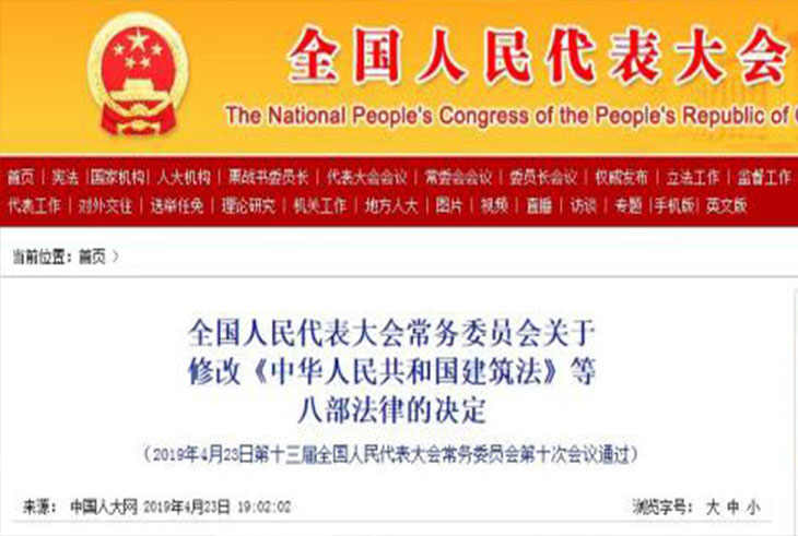 4月23日下午,第十三届全国人民代表大会常务委员会第十次会议,表决通过《中华人民共和国建筑法》、《中华人民共和国消防法》等八部法律的修改。